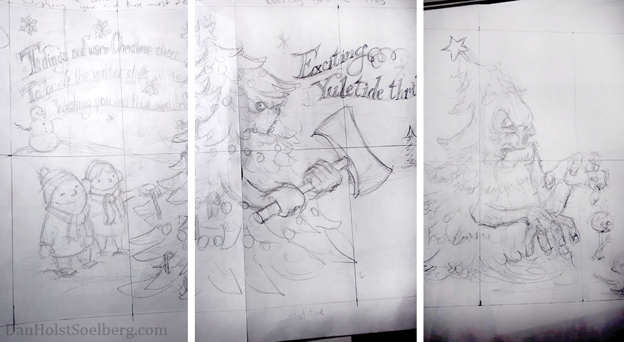 Left to right: Initial sketch of the card front; Original sketch of the axe-wielding tree monster; Revised tree monster with enormous hands instead of the axe. Without the weapon, I wanted his facial expression to be more animated. The ruled lines are drawn to help me figure out the layout, and to transfer elements to the final artwork.